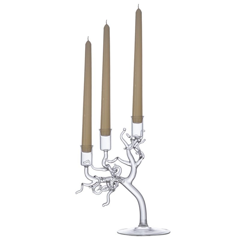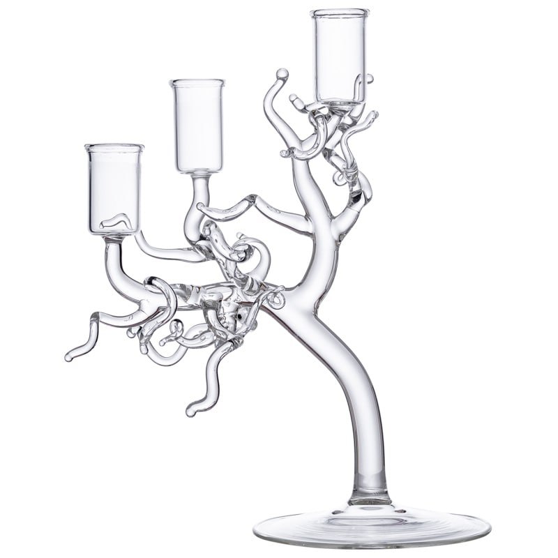 Sfesnicul decorativ executat manual din sticla termorezistenta are forma unui pom cu 3 ramuri pe care se pot pune 3 lumanari.