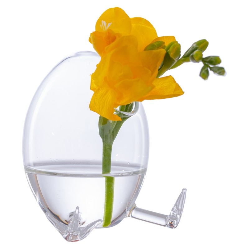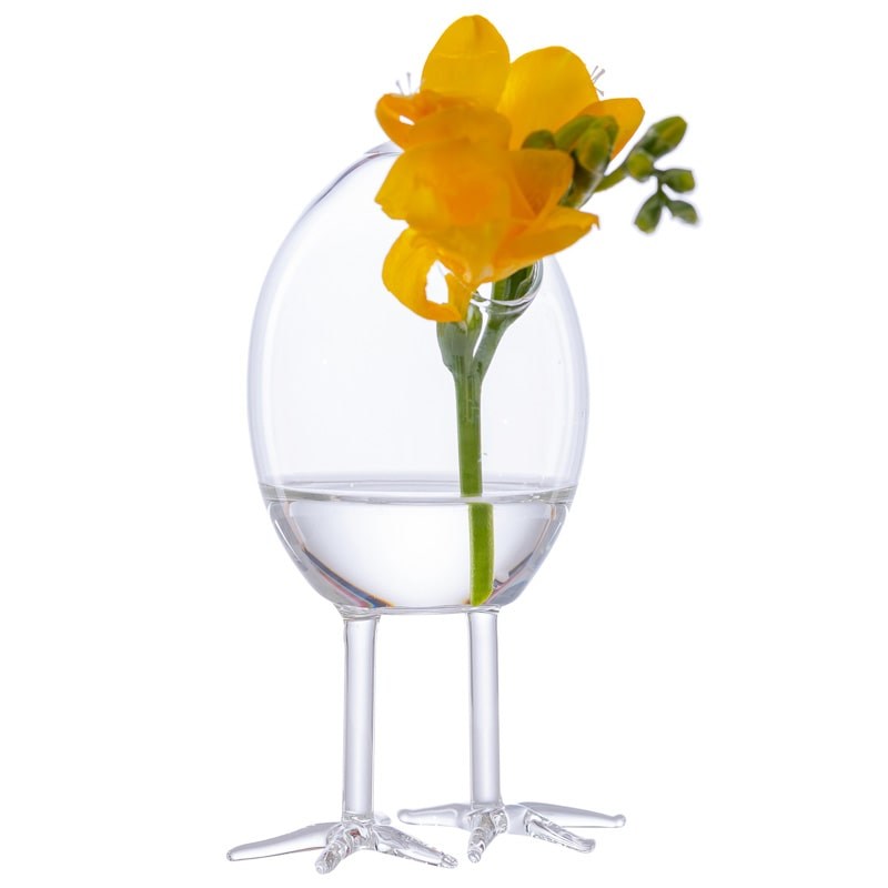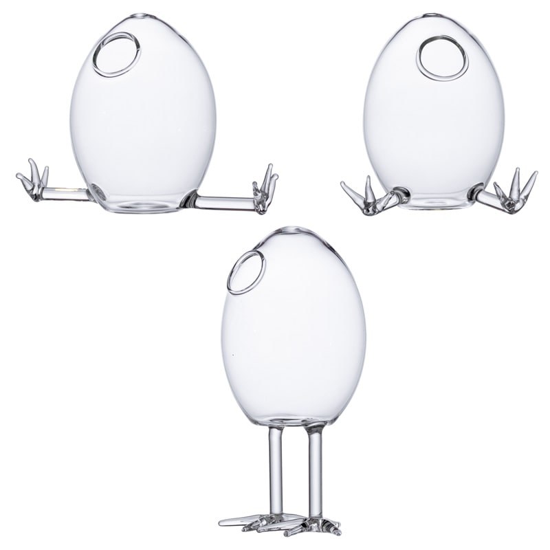 Vaza decorativa in forma unui ou din care iese un pui este realizata handmade din sticla transparenta.