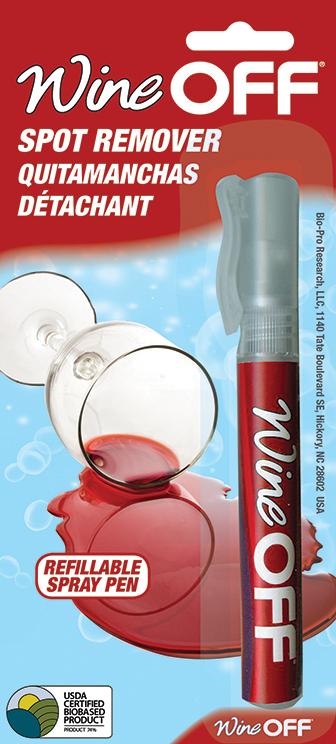 Wine Off stilou este un spray cu o capacitate de 10 ml, destinat indepartarii petelor de vin rosu si a altor pete organice aparute accidental in timpul calatoriilor. Se pulverizeaza Wine Off pe pata de vin, dupa care se asteapta 5 min pentru actiunea acestuia. Se spala (tamponeaza) cu apa si detergent, apoi se clateste numai cu apa. Pentru pete mai vechi, se lasa ca Wine Off sa actioneze cateva ore, dupa care se spala si se clateste cu apa.