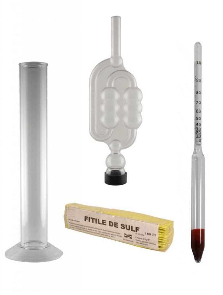 Setul de vinficare este compus dintr-un pachet de fitile de sulf, o palnie fermentare din plastic pentru vin care poate fi cea din imaginea de sus sau cea din imaginea a doua, in functie de stocul nostru. Mai contine un cilindru de testare si un alcoolmetru pentru determinarea concentratiei de alcool (domeniul de masurare este cuprins intre 0 - 96°).