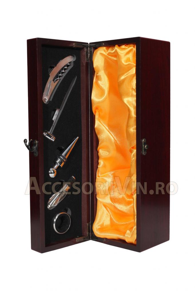 Cutia contine tirbuson, inel antipicurare, antipicurator cu dop, termometru si dop metalic, fiind recomandata pentru o sticla cu o capacitate de pana la 750 ml.