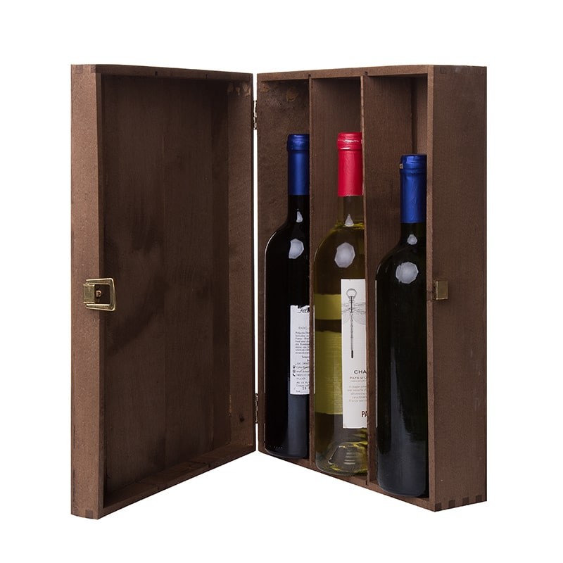 O cutie ideala pentru 3 sticle de vin, confectionata din lemn baituit maro. Are capac cu inchizatoare metalica si 2 despartitoare interioare. Pentru protectia sticlelor, cutia are si talas in interior.