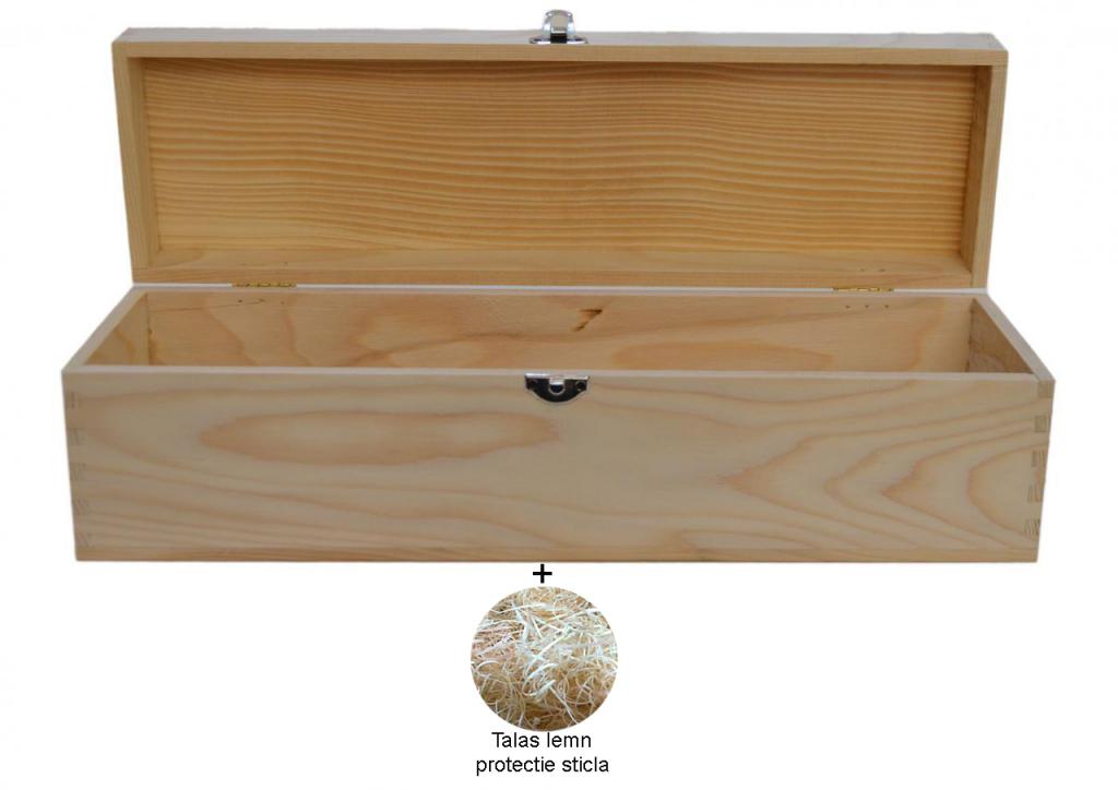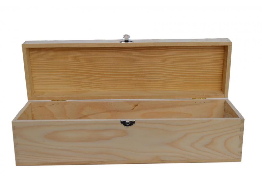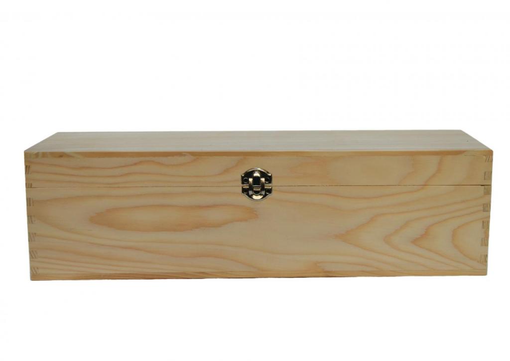 Cutie din lemn de brad potrivita pentru sticlele de vin de 1,5 l decorata cu o inchizatoare metalica ce o aseamana cu un cufar. Dimensiunile acestei cutii sunt: 107 x 107 x 370 mm, poate ingloba o sticla Magnum de vin.