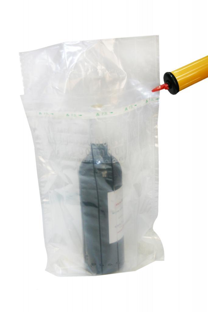 Cu punga gonflabila, sticlele de vin pot calatori oriunde in lume, fara nici cel mai mic risc! Punga transparenta, realizata din polietilena de joasa densitate, este prevazuta cu mini-supape ce permit aerului sa intre in cele 14 spatii longitudinale. Astfel, buteliile vor fi protejate pe tot timpul transportului.