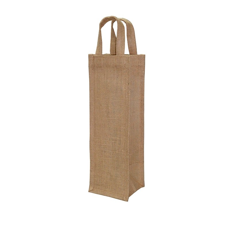 Confectionata din tesatura de iuta in culoare natur, aceasta punga cu doua toarte adauga un stil aparte sticlei de vin pe care o oferiti cadou. In interior, pentru asigurarea unei rezistente sporite si pentru a impiedica deformarea materialului, punga este dublata cu o folie subtire din plastic.