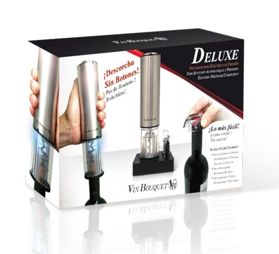 Printr-o simpla apasare de buton, tirbusonul electric Deluxe va extrage in mod automat dopul din sticla de vin. Acesta deschide 30 de butelii cu o singura incarcare.
