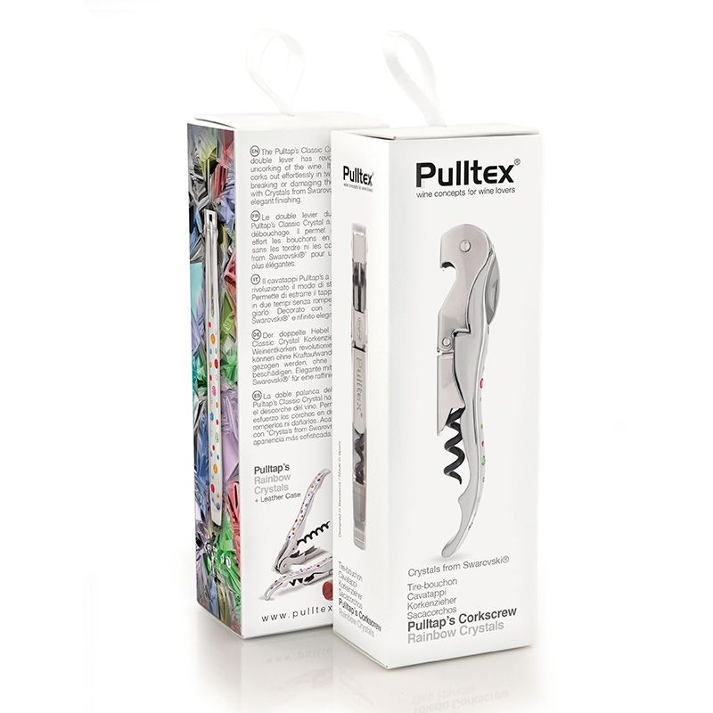 Tirbusonul Pulltap are parghie dubla. Manerul sau este decorat cu cristale Swarovsky de diverse culori care asigura un aspect elegant si sofisticat. Tirbusonul permite extragerea dopurilor de pluta fara efort, fara a le rupe sau a le deteriora. Un etui din piele ecologica este inclus in pret.