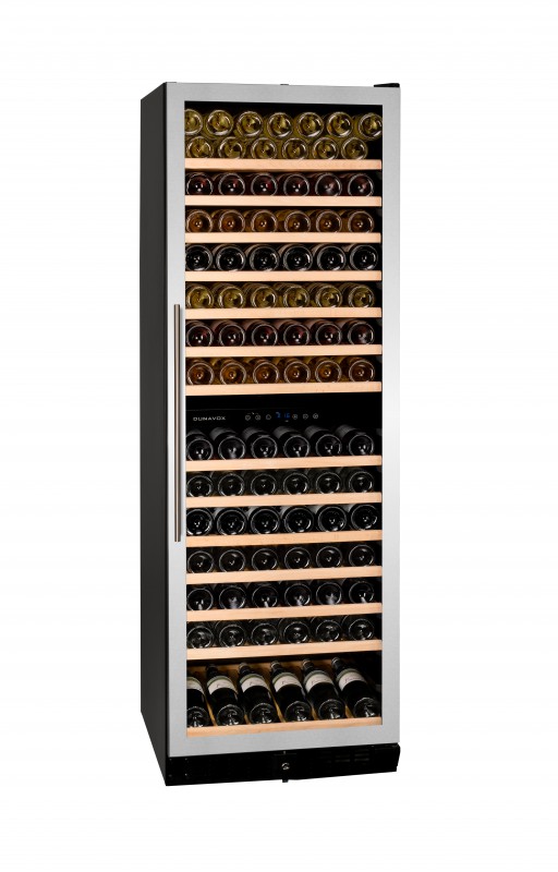 Racitor pentru sticle de vin din gama Dunavox GRANDE, cu compresor, cu doua zone de temperatura. Aparatul este negru cu rafturi din lemn cu glisiere, usa cu geam sticla. Iluminarea interioara LED are culoare albastra. Aparatul are inchidere cu cheie. Poate fi incorporat sau utilizat de sine statator.