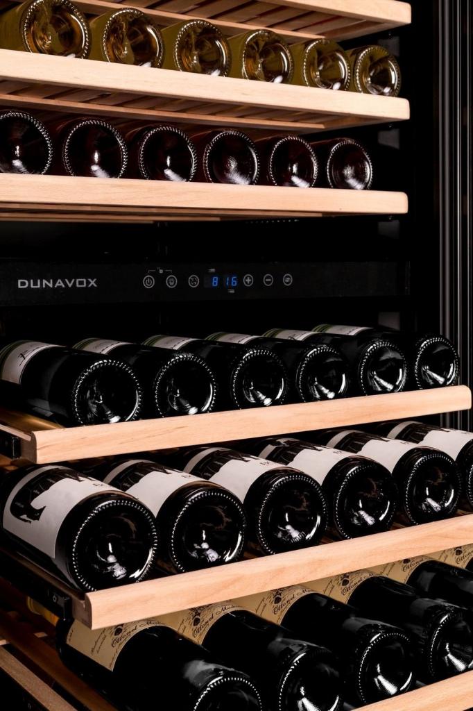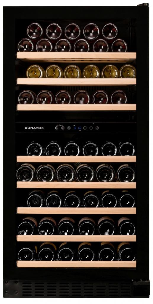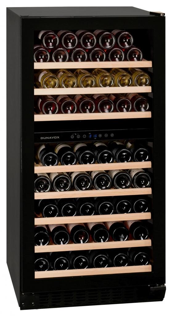 Racitor Dunavox cu sistem de racire prin compresor cu doua camere. Acest model este creat pentru a fi incorporat sub blat sau folosit de sine statator. Sticlele stau asezate pe rafturi lemn cu glisiere. Aparatul are iluminare interioara LED de culoare albastra.