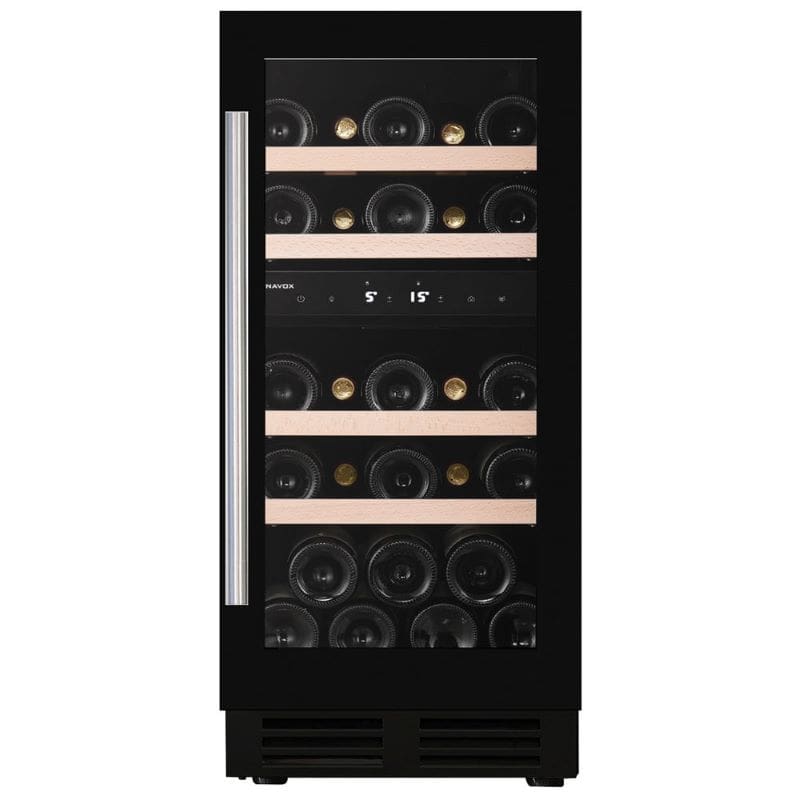 Racitorul acesta are 2 zone de temperatura si racire cu compresor. Apartine gamei Dunavox FLOW integrabila sub blat. Manerul usii este din inox; iluminarea interioara a aparatului este de culoare alba, portocalie sau albastra. Se pot raci maxim 32 sticle de capacitate 0,75 L, asezate pe rafturi lemn.