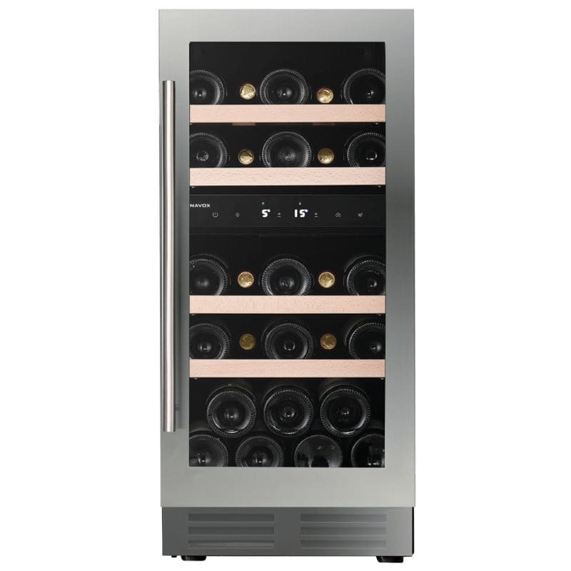 Racitorul cu 2 zone de temperatura apartine gamei Dunavox FLOW integrabila sub blat. Are sistem de racire cu compresor. Manerul si rama usii sunt din inox; iluminarea interioara LED are culoare alba, portocalie sau albastra. Se pot raci maxim 32 sticle de capacitate 0,75 L asezate pe rafturi de lemn.