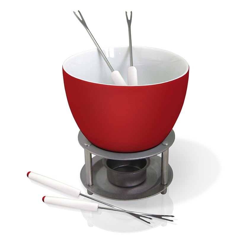 Setul fondue de la Vin Bouquet este compus dintr-o caserola de ceramica de culoare alba in interior si rosie la exterior, 4 frigarui, o baza de otel inoxidabil si o lumanare. Suportul din otel are 3 picioruse, ceea ce il face stabil si se evita alunecarea. Cu lumanarea se topeste rapid ciocolata / branza.