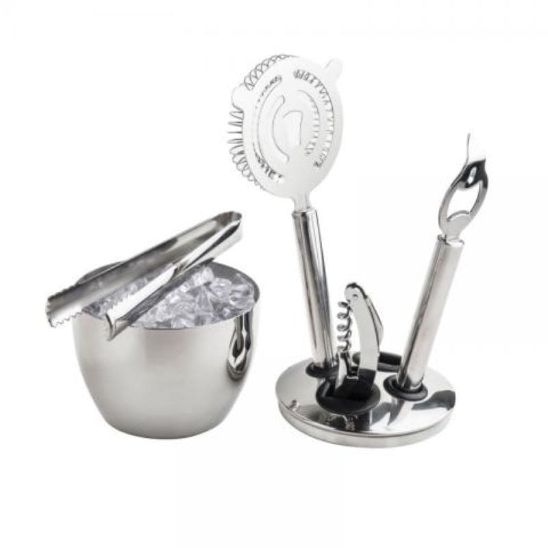Setul este compus din: suport, ghetiera, desfacator pentru vin, desfacator pentru cutii, sita strecuratoare, cleste. Toate aceste accesorii sunt din inox. Suportul are rolul de depozitare a accesoriilor din set, in acest fel setul ocupa putin spatiu cand nu este utilizat.