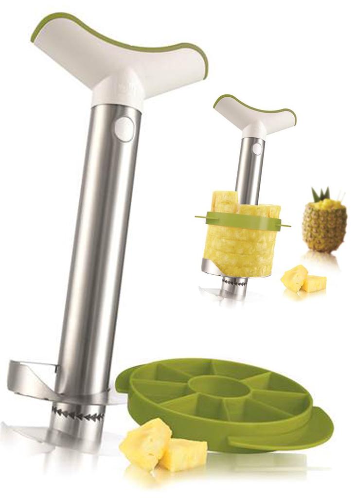 Feliator ananas, marca Tomorrow`s Kitchen, confectionat din inox, asigura decojirea, indepartarea miezului si felierea intr-o singura operatie, pastrand in acelasi timp sucul fructului.