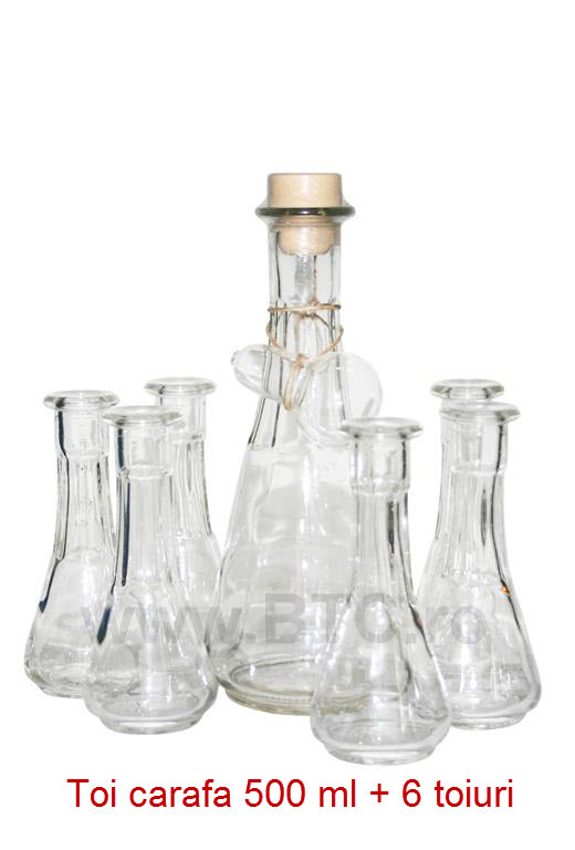 Pentru servirea traditionalei tuici se recomanda setul alcatuit dintr-o carafa si 6 toiuri, toate acestea fiind confectionate din sticla.