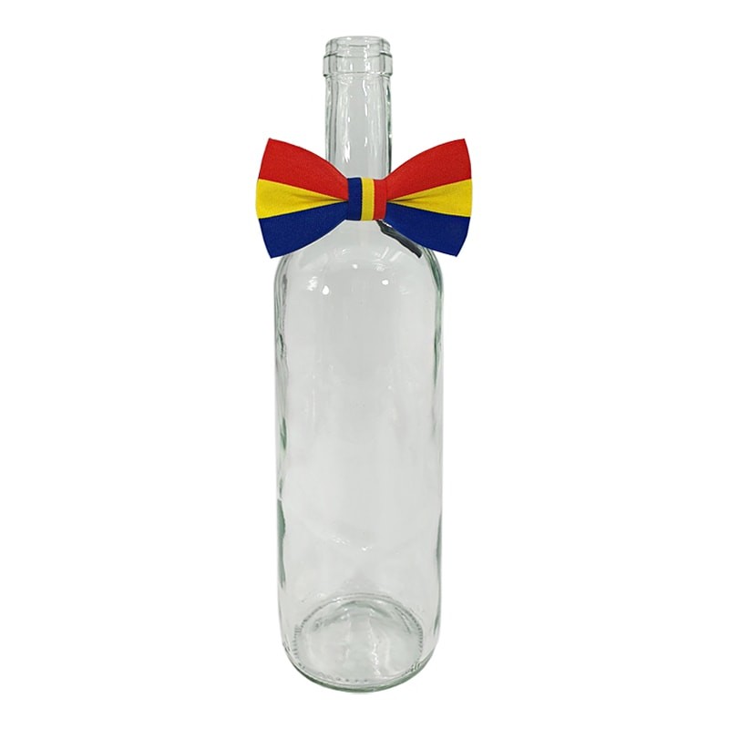 Papionul din material tricolor este un accesoriu decorativ pentru o sticla vin. Se leaga cu o panglica pe gatul sticlei asezate pe masa festiva sau poate fi un cadou deosebit.