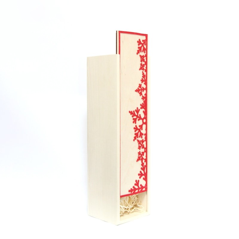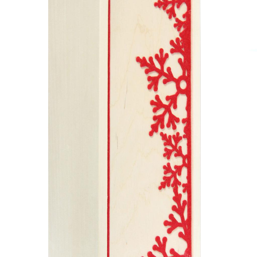 Cutia din lemn natur se poate transforma intr-un ambalaj de Craciun pentru o sticla vin, prin motivul aplicat pe capac. Realizat din fetru decupat cu laserul si apoi lipit pe capac, acest motiv delicat reprezinta stelute de nea.