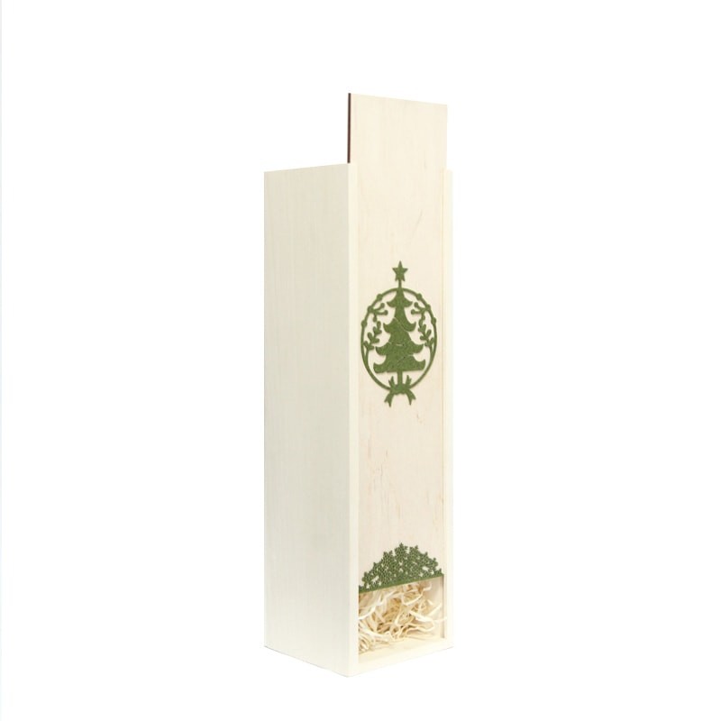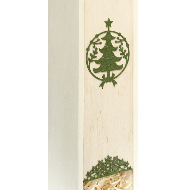 Cand doriti sa oferiti o sticla de vin cadou de Craciun, trebuie sa alegeti cu grija un ambalaj potrivit. Va propunem aceasta cutie din lemn natur care are capac culisant. Capacul este decorat cu un motiv de Craciun - un glob cu bradut - obtinut din fetru decupat cu laserul si lipit pe capac.