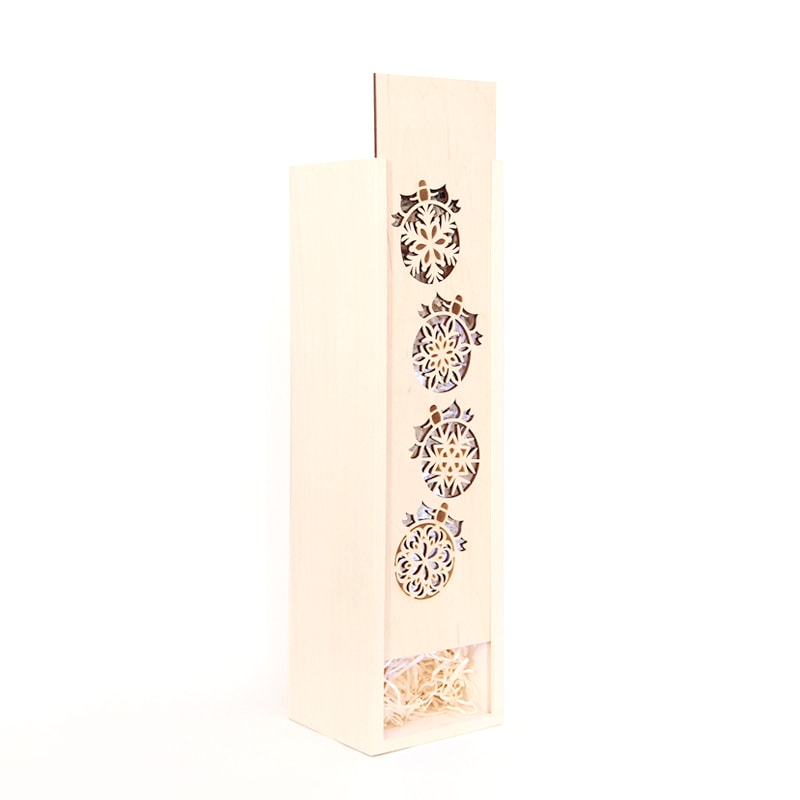 Cutia din lemn natur pentru o sticla vin are capacul decorat cu fulgi de nea. Decorarea capacului este realizata prin gravare si decupare laser.