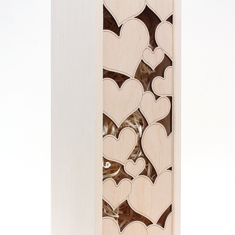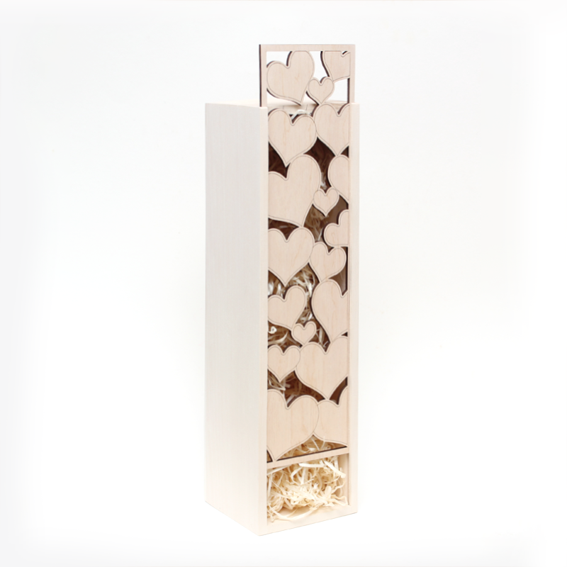 Cutia din lemn natur are capacul culisant in care sunt decupate cu laser inimi. In interiorul cutiei se potriveste o sticla cu dimensiunile maxime de 37 cm inaltime si 9,4 cm diametru.