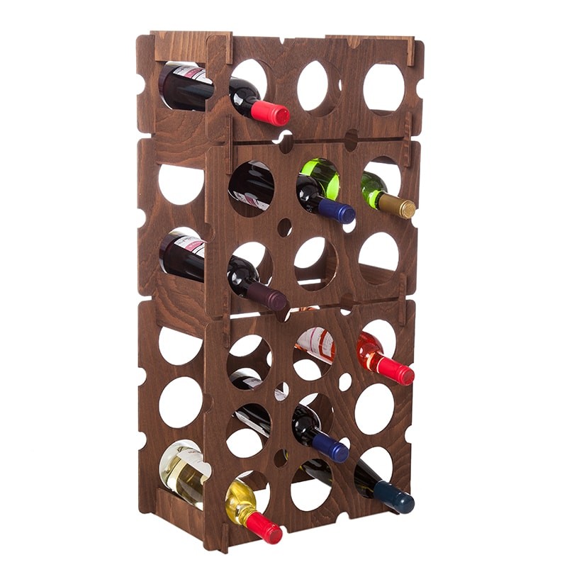 Raft din placaj de 6 mm grosime compus din 3 rafturi supapuse: unul pentru 3 sticle, al doilea pentru 6 sticle si al treilea pentru 9 sticle. Prin suprapunerea celor 3 rafturi cu ajutorul unor conectori dubli din placaj, se obtine o capacitate de depozitare mai mare, de 18 sticle. Sticlele stau in pozitie orizontala, usor inclinate, astfel incat dopul este permanent in contact cu vinul si nu permite patrunderea aerului in sticla. Poza este cu titlu de prezentare, pot exista diferente de nuanta fata de imaginea produsului. Dimensiuni raft: inaltime 76,5 cm, latime 40 cm, adancime 22,5 cm.