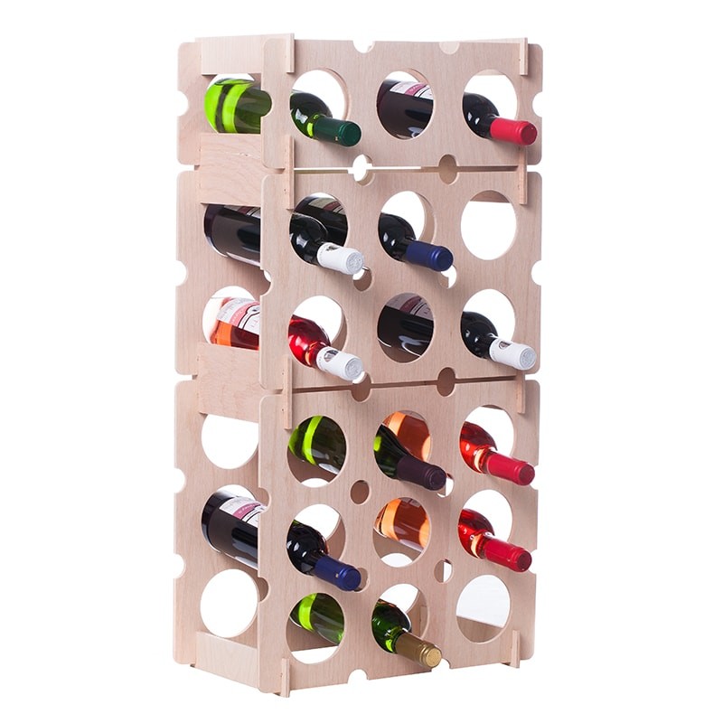 Obtinut prin suprapunerea a 3 mini-rafturi natur (unul de 3 sticle, unul de 6 sticle si unul de 9 sticle), acest raft are o capacitate mai mare de depozitare. Este confectionat din placaj cu grosimea de 6 mm si pentru imbinarea celor 3 rafturi se utilizeaza conectori dubli din placaj.