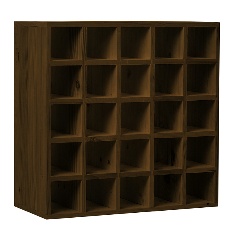Raftul din lemn baituit maro, nelacuit, poate depozita maxim 25 sticle vin. Este potrivit pentru a fi utilizat atat in propria locuinta, cat si in baruri si crame. Are dimensiuni mici si greutate redusa.