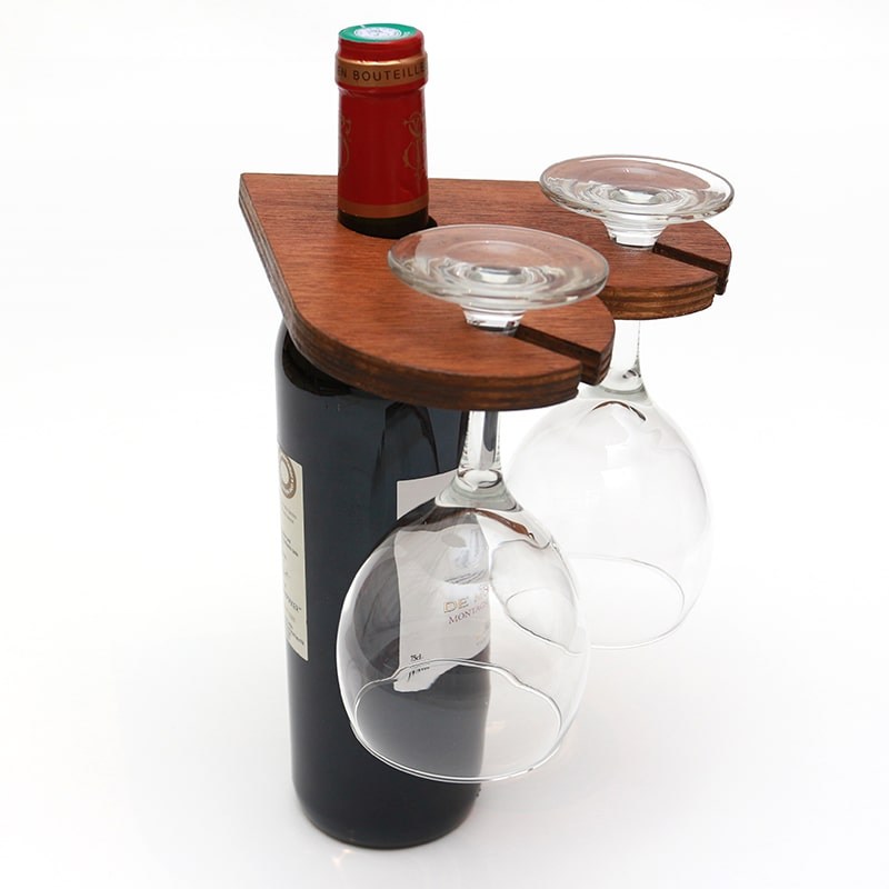 Confectionat din placaj baituit maro, este modul de prezentare ideal pentru o sticla de vin si 2 pahare.
