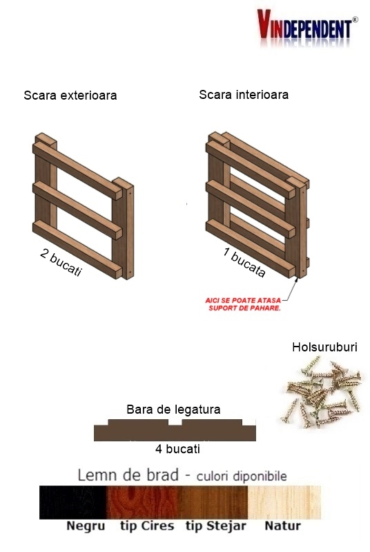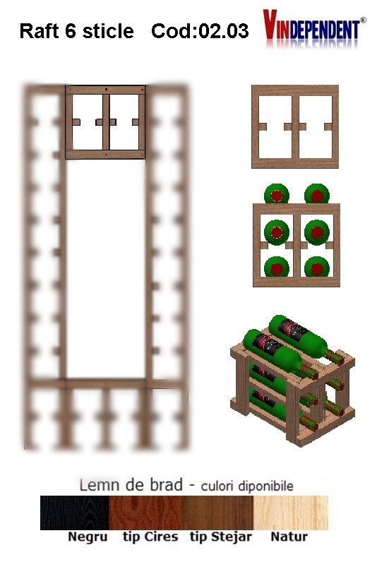 Raft din lemn de brad cu capacitatea de a stoca 6 sticle de vin. Produsul se poate prinde de alte rafturi din aceeasi categorie, formand astfel un perete cu "trofee" cu design propriu.