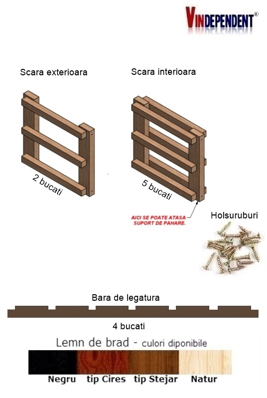 Raftul are capacitatea de a stoca 18 sticle de vin. Culorile disponibile sunt: negru, tip cires, tip stejar si natur.