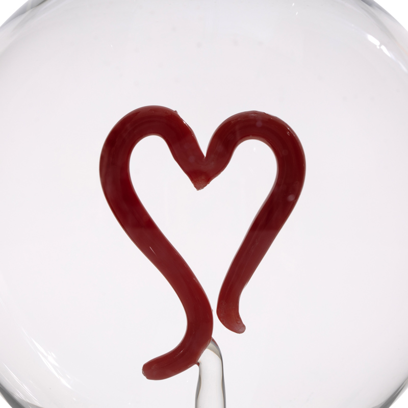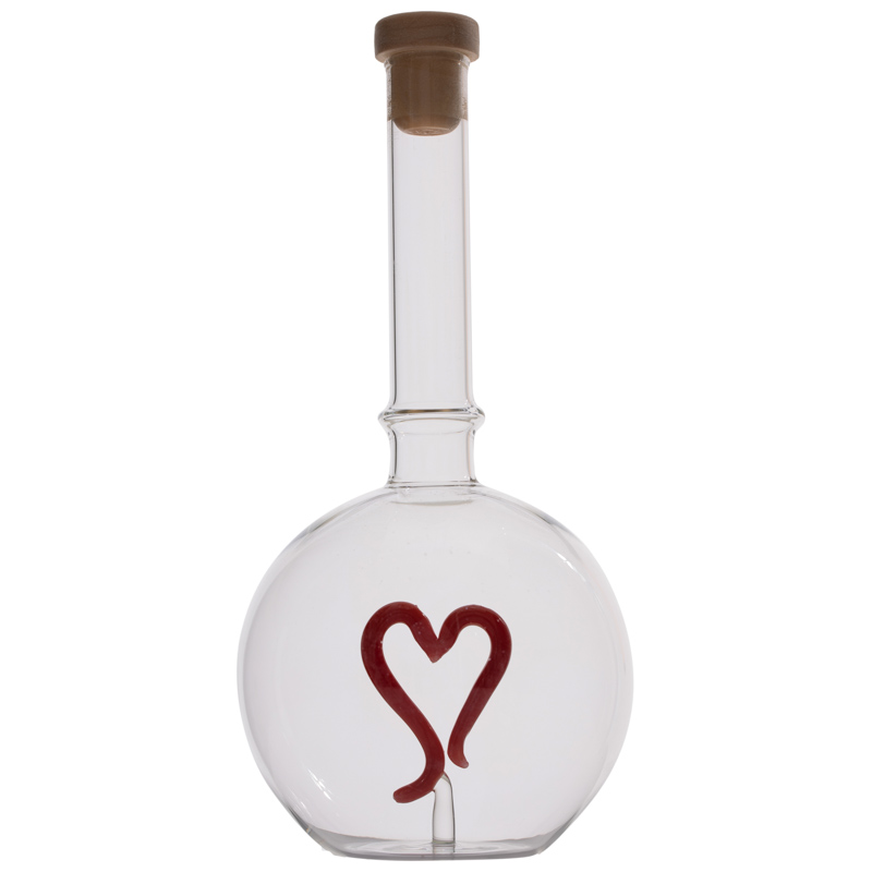 Sticla are forma unui balon cu capacitate de 500 ml, in interiorul caruia este o inima stilizata executata manual din sticla colorata.