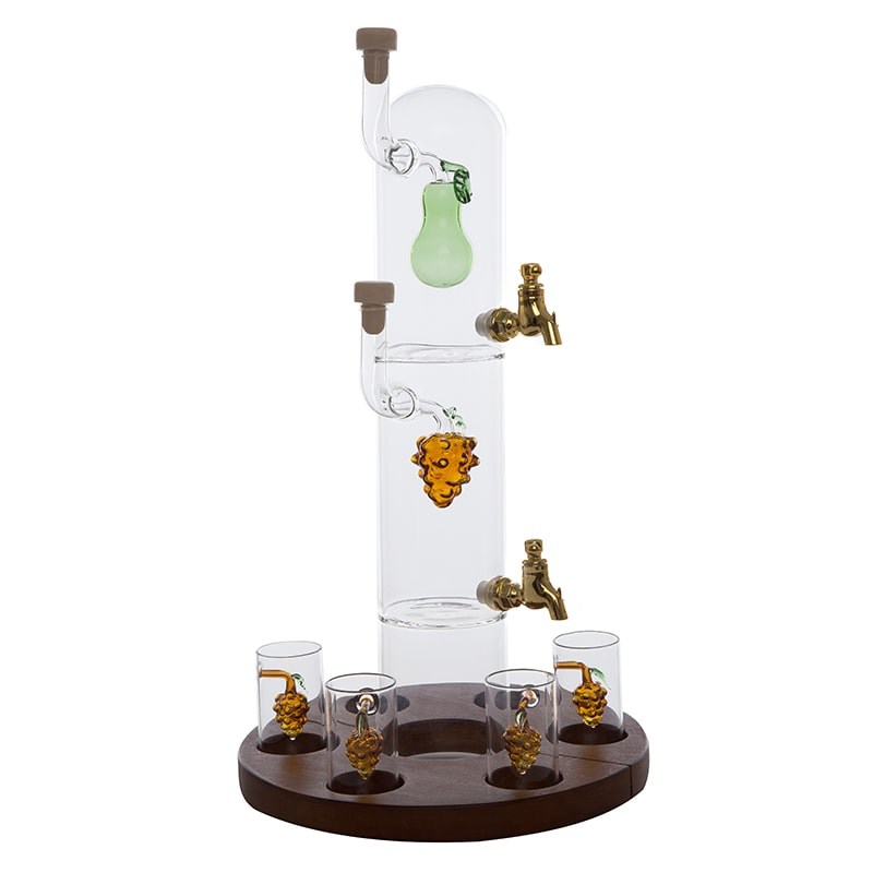 Sticla cilindrica cu 2 compartimente este realizata manual din sticla termorezistenta. Fiecare compartiment are un fruct din sticla colorata in interior si un robinet lateral. De asemenea, fiecare compartiment are un tub lateral pentru umplere cu alcool. Capacitatea unui compartiment este 400 ml. Pentru turnarea alcoolului in pahar se scoate dopul tubului lateral si se deschide robinetul. Impreuna cu sticla se livreaza si 6 pahare cu un fruct colorat in interior; paharele pot avea acelasi fruct in interior sau diferit (cate 2 pahare cu acelasi fruct). Fiecare pahar are dimensiunile 36 mm diametru exterior si 65 mm inaltime.?