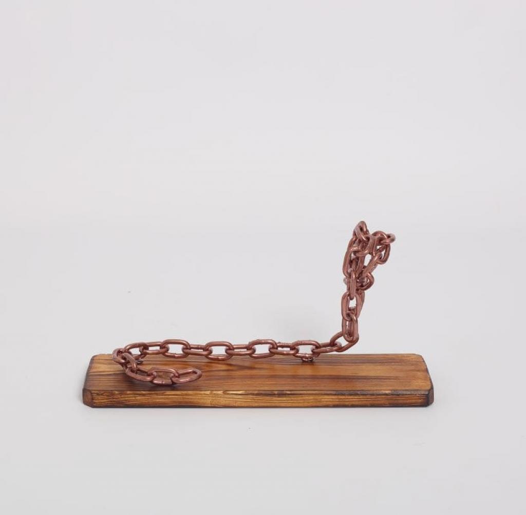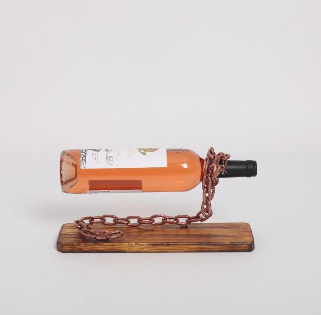 Suportul in forma de lant pentru o sticla vin este creat handmade din lemn natur de brad tratat si fier. Lantul aramiu cu zale este suficient de puternic pentru a sustine o sticla plina, oferind senzatia de plutire a sticlei.