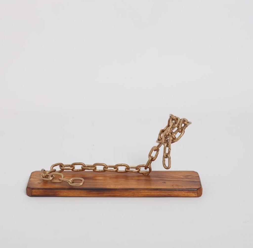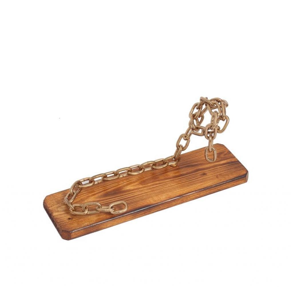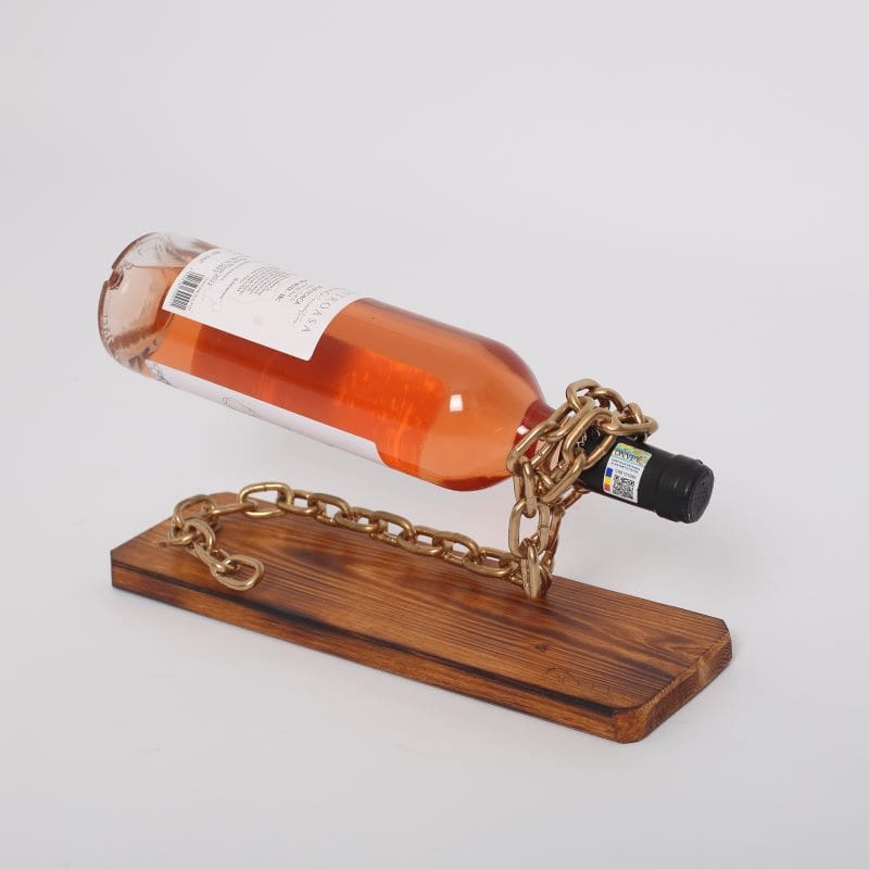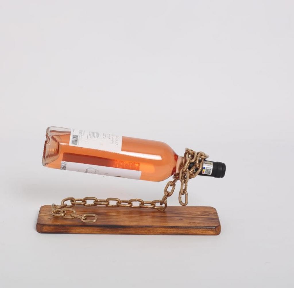 Suportul in forma de lant, pentru o sticla vin, este creat handmade din lemn natur de brad tratat si elemente de fier. Lantul cu zale este suficient de solid pentru a sustine in siguranta sticla de vin, care pare a pluti in aer.