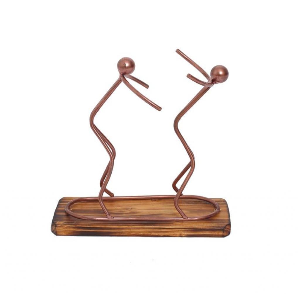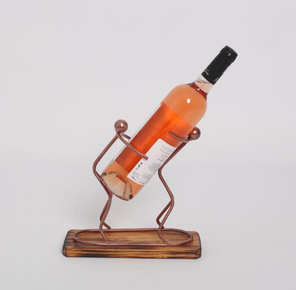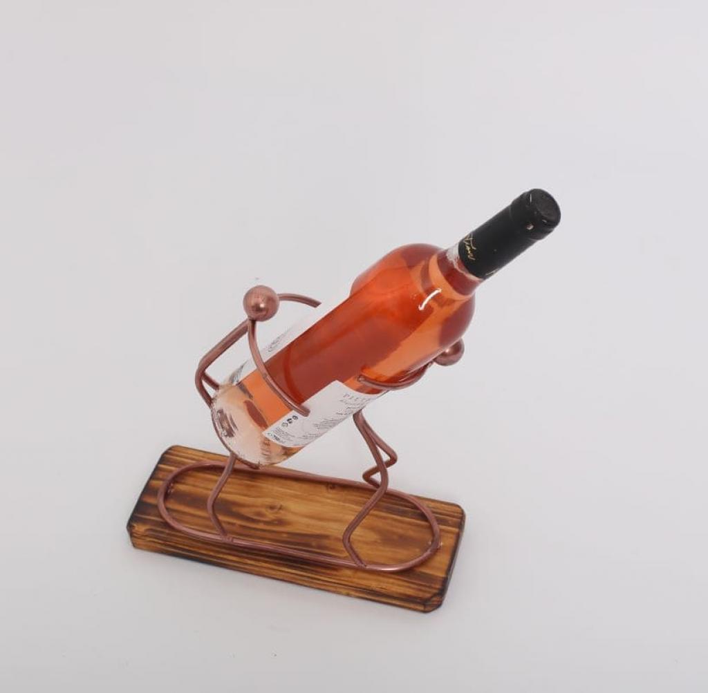 Suportul Twins creat handmade sustine in deplina siguranta o sticla vin. Suportul este executat din lemn natur de brad tratat si elemente de fier de culoare aramie.